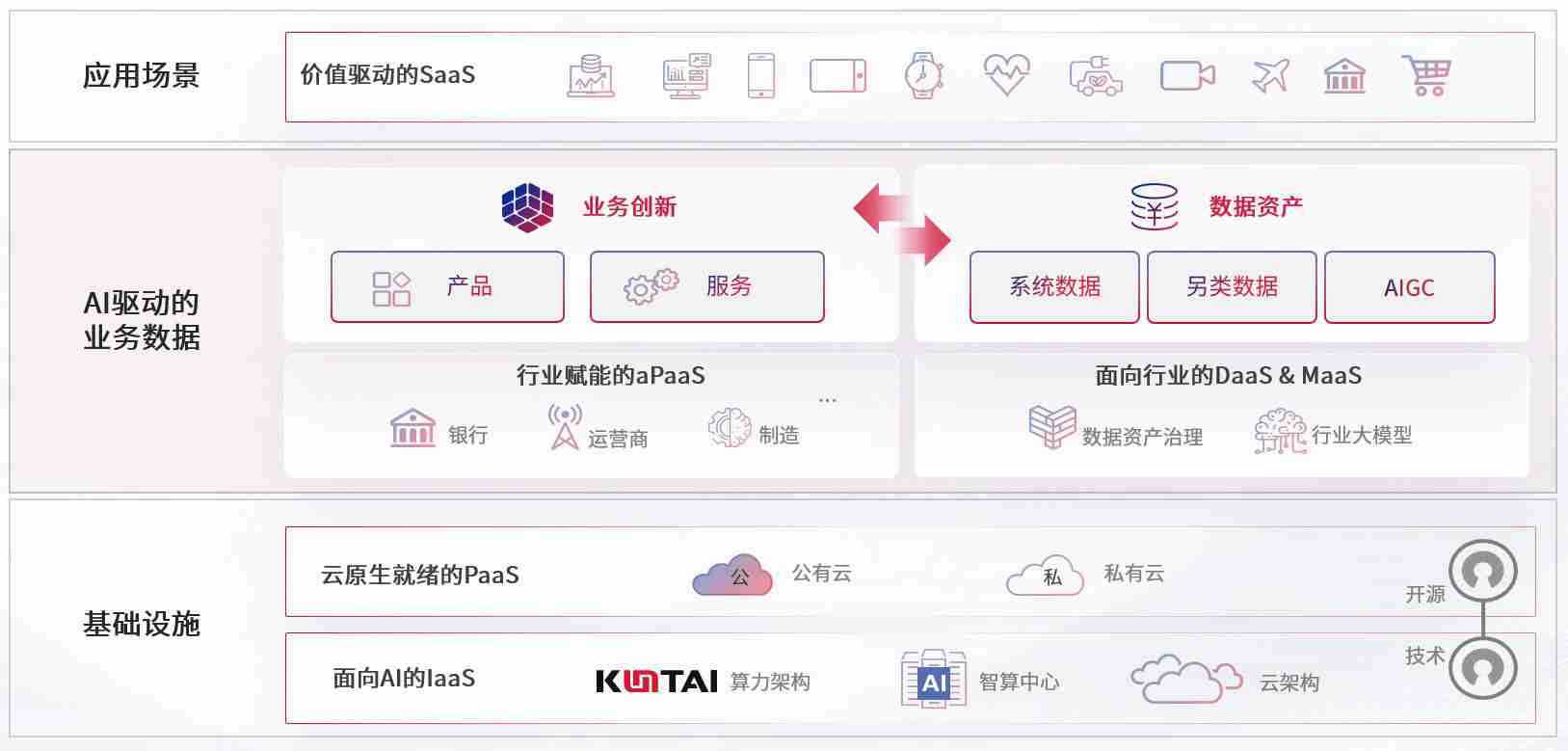 数字时代,,,,围绕企业数字化转型的关键要素,,,尊龙z6数码开创性的提出数云融合战略和技术体系框架,,着力在云原生、、、、数字原生、、、AI原生和信创产业上架构产品和服务能力,,,为处在不同数字化转型阶段的快消零售、、汽车、、、金融、、医疗、、、政企、、教育、、运营商等行业客户提供泛在的敏捷IT能力和融合的数据驱动能力,,构建跨界融合创新的数字业务场景和新业务模式,,助力企业级客户建立面向未来的核心能力和竞争优势,,,全面推动社会的数字化、、、、智能化转型升级。。